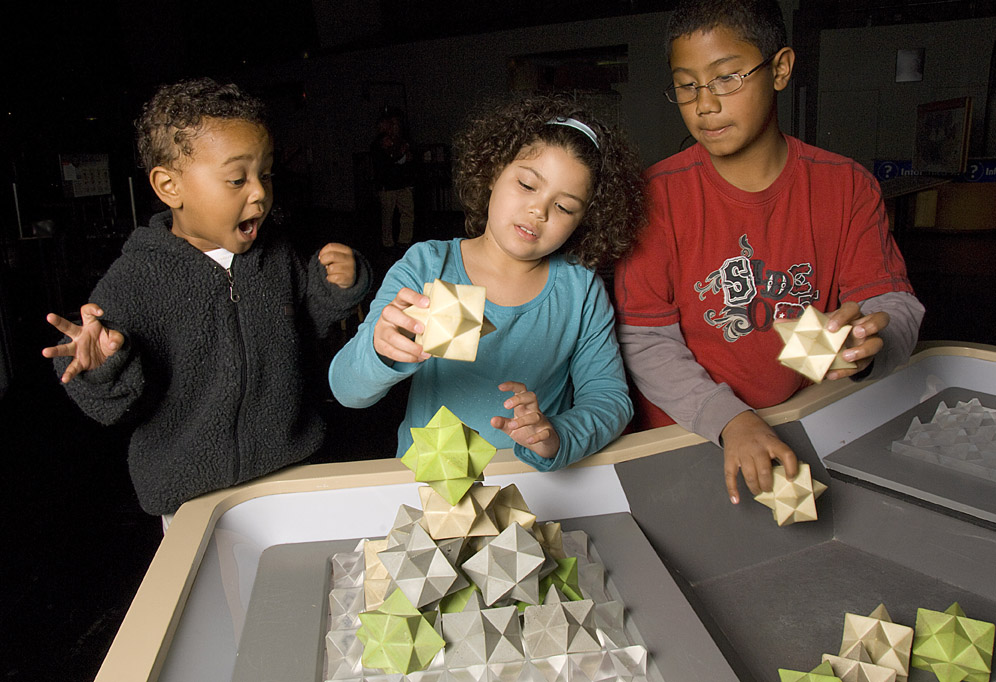 The focus of the Geometry Playground is shape, with different exhibits letting the visitor explore shapes as we see things, shapes that surround us, how shapes can fit together, and shapes as they relate to motion.